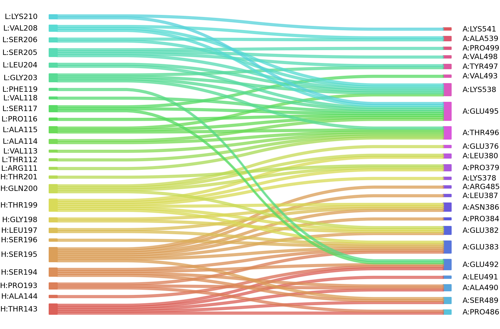 : residuesposition H: THR143 ALA144 PRO193 SER195 SER196 GLY198 THR199 GLN200 L: VAL113 ALA114 ALA115 PRO116 SER117 VAL118 PHE119 GLY203 LEU204 SER205 SER206 VAL208 LYS210 A: PRO379 GLU382 GLU383 ASN386 LEU387 PRO486 SER489 ALA490 GLU492 VAL493 GLU495 THR496 PRO499 LYS538 ALA539 LYS541 |