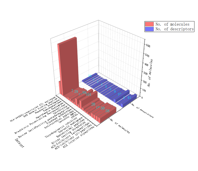 For peptide datasets in our database, the 3D graph shows the number of active peptides contained in each peptide dataset and amino acid descriptors used to characterize the peptide structures.